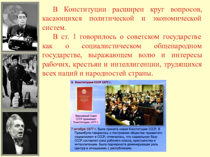 ст. 1 говорилось о советском государстве как о социалистическом общенародном государстве, выражающем волю и интересы рабочих, крестьян и интеллигенции, трудящихся всех наций и народностей страны.