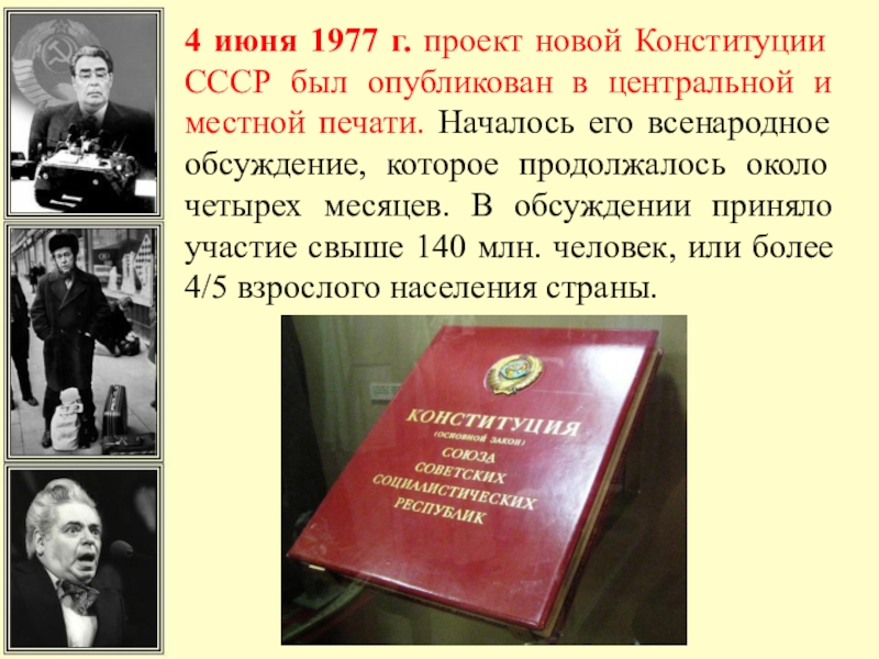 Слайд 174 июня 1977 г. проект новой Конституции СССР был опубликован в