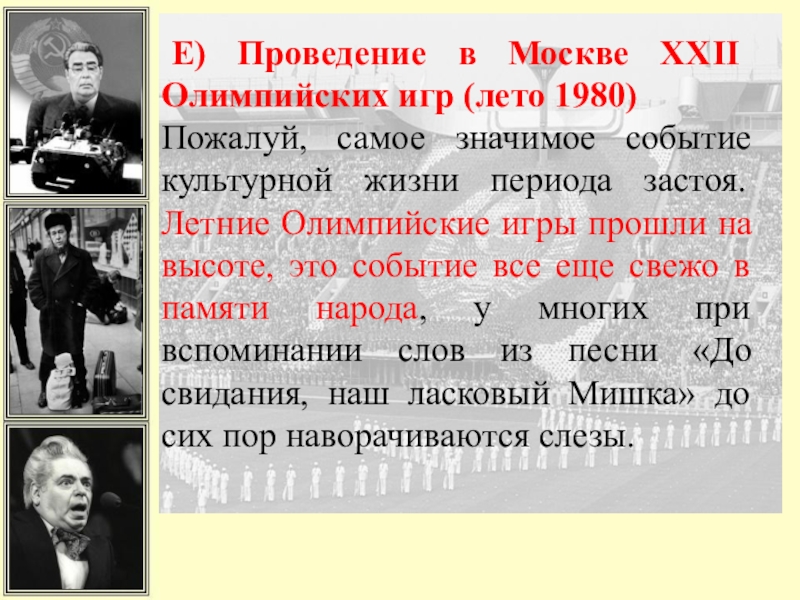 событие культурной жизни периода застоя. Летние Олимпийские игры прошли на высоте, это событие все еще свежо в памяти народа, у многих при вспоминании слов из песни «До свидания, наш ласковый Мишка» до сих пор наворачиваются слезы.