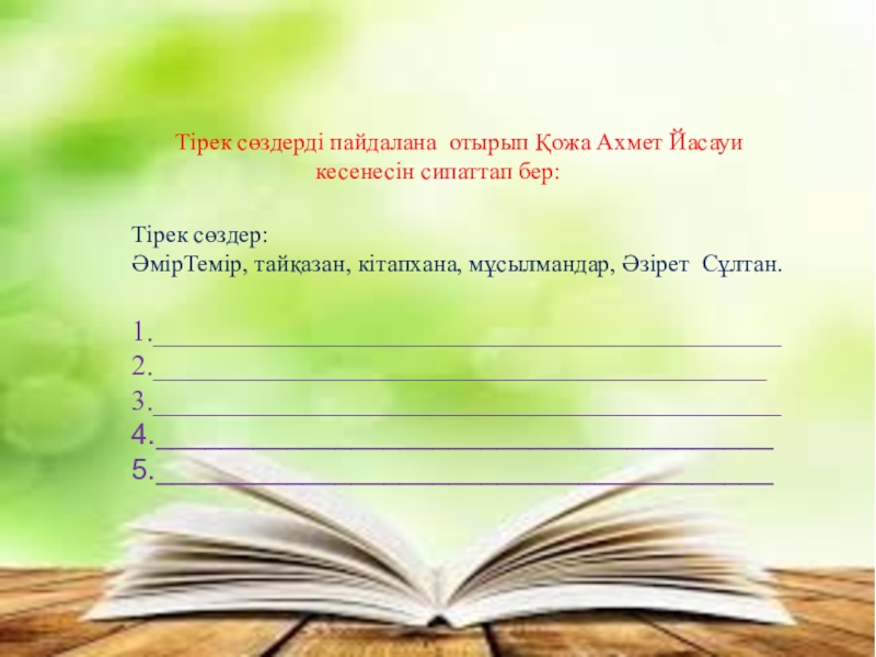 Тірек сөздерді пайдалана отырып Қожа Ахмет Йасауи кесенесін сипаттап бер: Тірек сөздер:    ӘмірТемір, тайқазан,