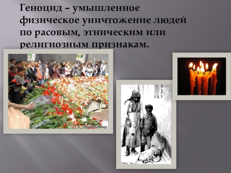 Слайд 5Геноцид – умышленное физическое уничтожение людей по расовым, этническим или религиозным