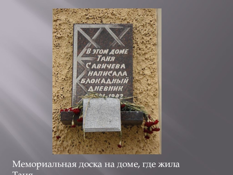 Слайд 15Мемориальная доска на доме, где жила Таня