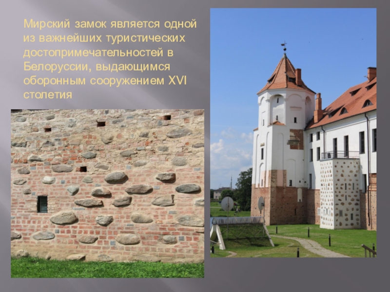 Слайд 2Мирский замок является одной из важнейших туристических достопримечательностей в Белоруссии, выдающимся