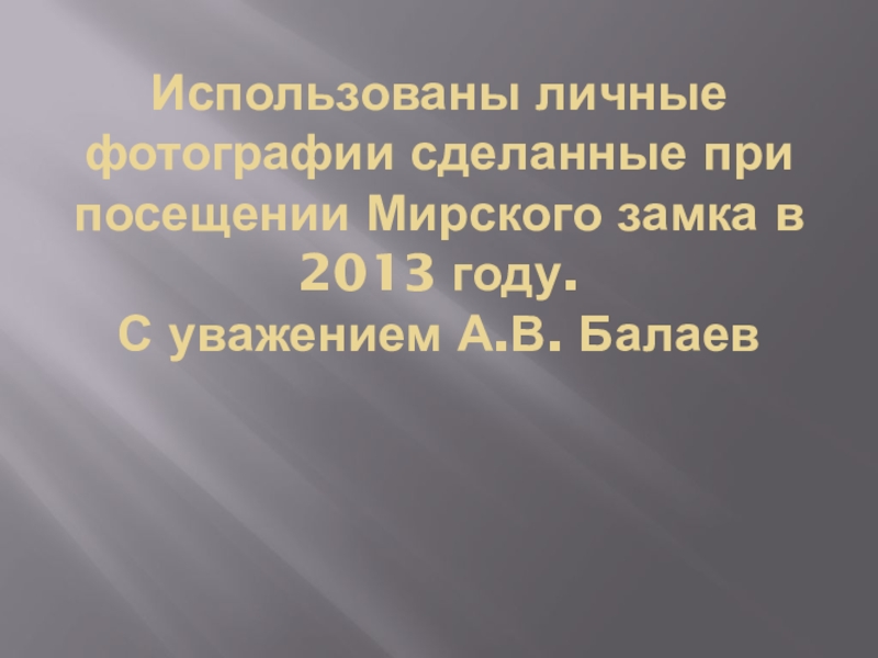 Использованы личные фотографии сделанные при посещении Мирского замка в 2013 году.  С уважением А.В. Балаев