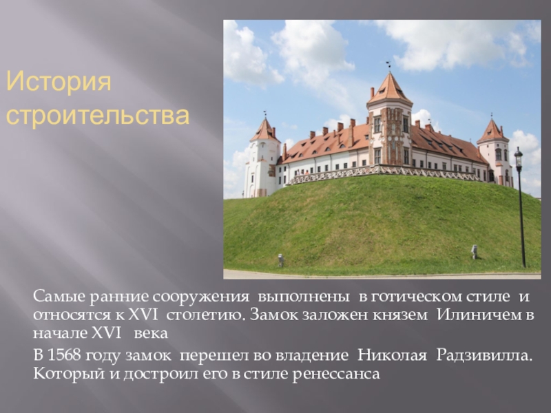 История строительстваСамые ранние сооружения выполнены в готическом стиле и относятся к XVI столетию. Замок заложен князем Илиничем
