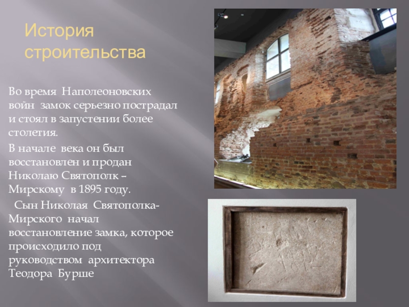Сын Николая Святополка-Мирского начал восстановление замка, которое происходило под руководством архитектора Теодора Бурше