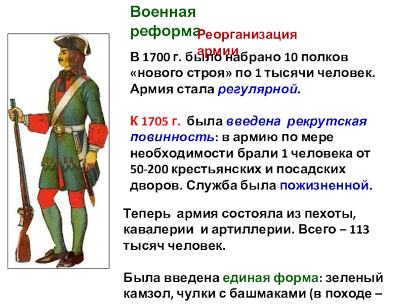 Была введена единая форма: зеленый камзол, чулки с башмаками (в походе – сапоги), треуголка.