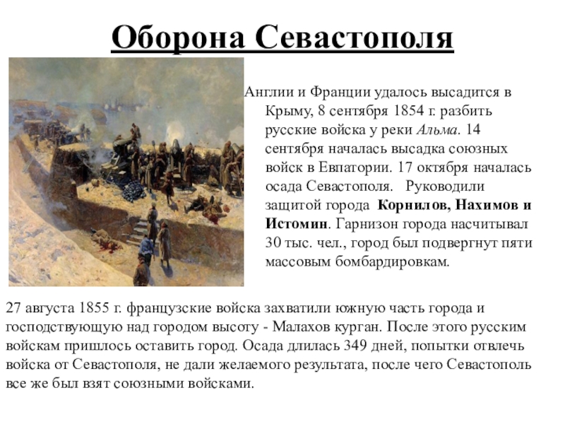 27 августа 1855 г. французские войска захватили южную часть города и господствующую над городом высоту - Малахов курган. После этого русским войскам пришлось оставить город. Осада длилась 349 дней, попытки отвлечь войска от Севастополя, не дали желаемого результата, после чего Севастополь все же был взят союзными войсками.