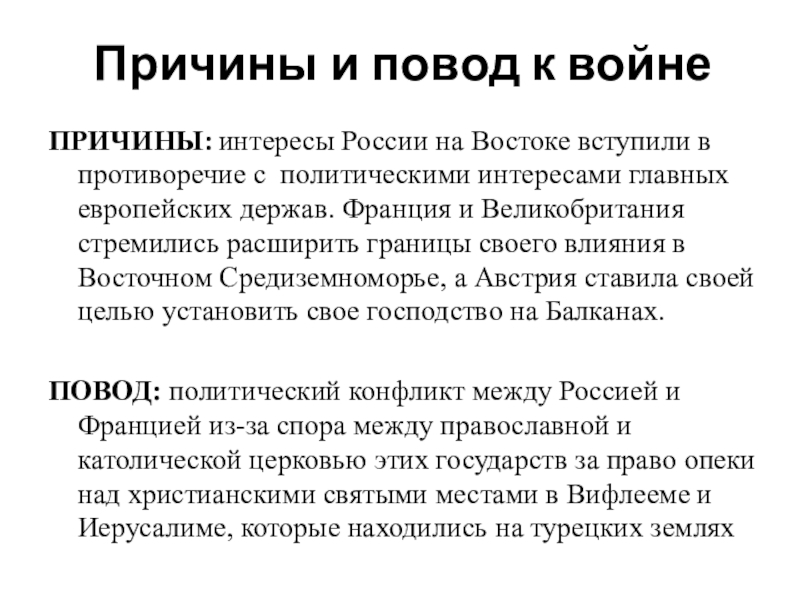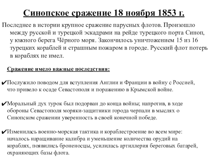 Послужило поводом для вступления Англии и Франции в войну с Россией, что привело к осаде Севастополя и поражению в Крымской войне.