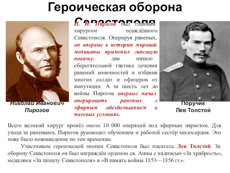 Всего великий хирург провёл около 10 000 операций под эфирным наркозом. Для ухода за ранеными, Пирогов руководил обучением и работой сестёр милосердия. Это тоже было нововведение по тем временам.