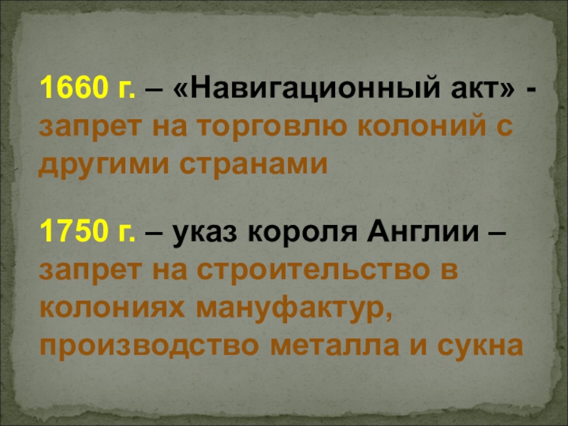 1750 г. – указ короля Англии – запрет на строительство в колониях мануфактур, производство металла и сукна
