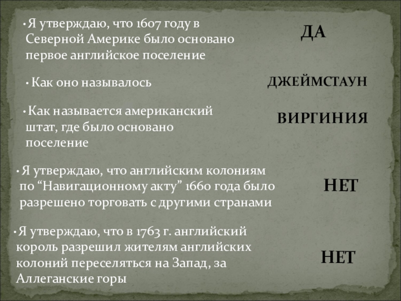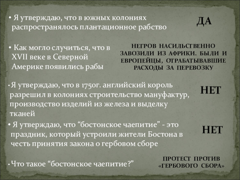 Я утверждаю, что в 1750г. английский король разрешил в колониях строительство мануфактур, производство изделий из железа и выделку тканей