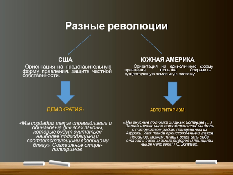 «Мы гнусные потомки хищных испанцев […] Затем незаконное потомство соединилось с потомством рабов, привезенных из Африки. Имя такое происхождение и такое прошлое, можем ли мы позволить себе ставить законы выше лидеров и принципы выше человека?» С.Боливар.