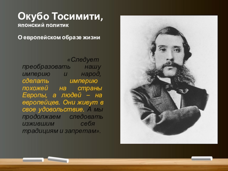 преобразовать нашу империю и народ, сделать империю похожей на страны Европы, а людей – на европейцев. Они живут в свое удовольствие. А мы продолжаем следовать изжившим себя традициям и запретам».