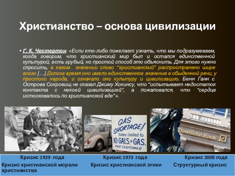 мы подразумеваем, когда говорим, что христианский мир был и остался единственной культурой, есть грубый, но простой способ это объяснить. Для этого нужно спросить, в каком значении слово “христианский” распространено шире всего […] Долгое время оно имело единственное значение в обыденной речи, у простого народа, и означало оно культуру и цивилизацию. Бенн Ганн с Острова Сокровищ не сказал Джиму Хокинсу, что “испытывает недостаток контакта с некоей цивилизацией”, а пожаловался, что “сердце истосковалось по христианской еде”».