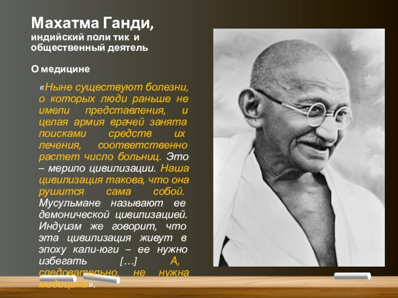 болезни, о которых люди раньше не имели представления, и целая армия врачей занята поисками средств их лечения, соответственно растет число больниц. Это – мерило цивилизации. Наша цивилизация такова, что она рушится сама собой. Мусульмане называют ее демонической цивилизацией. Индуизм же говорит, что эта цивилизация живут в эпоху кали-юги – ее нужно избегать […] А, следовательно, не нужна медицина».