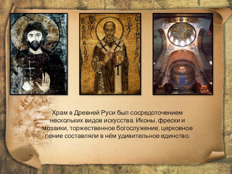 Внутреннее убранство Софийского собора отличалось изысканностью и богатством. Стены были покрыты фресками – картинами, написанными водяными красками по сырой штукатурке. Фрески и мозаики отличались яркостью, искусным подбором тонов.