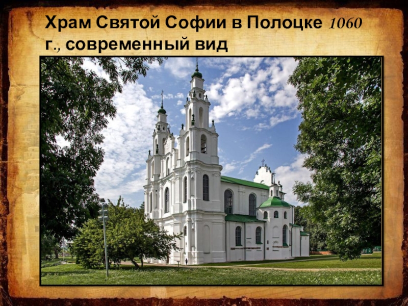 Софийский собор в Новгороде был возведен в 1045-1050 гг. «повелением князя Ярослава и сына его Владимира и архиепископа Луки». Внутреннее пространство Софии из-за массивных столбов, а также из-за узких межстолпных сводов, кажется несколько стесненным и не гармонирующим со строгой простотой внешних форм здания. Оказывается, и внутри, так же, как и снаружи, нет ничего лишнего, не оправданного конструктивными надобностями.