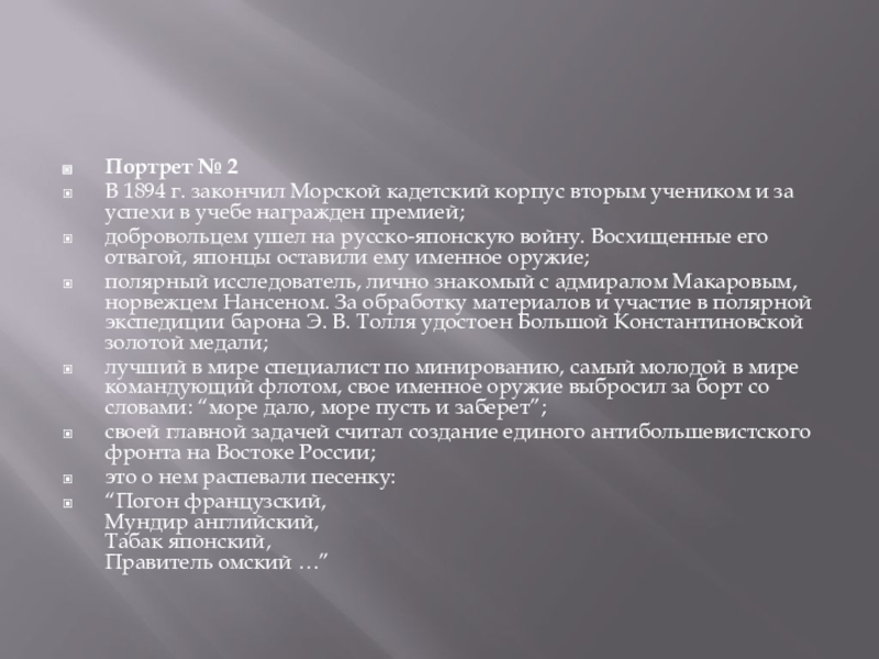 полярный исследователь, лично знакомый с адмиралом Макаровым, норвежцем Нансеном. За обработку материалов и участие в полярной экспедиции барона Э. В. Толля удостоен Большой Константиновской золотой медали;