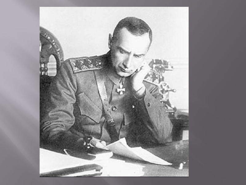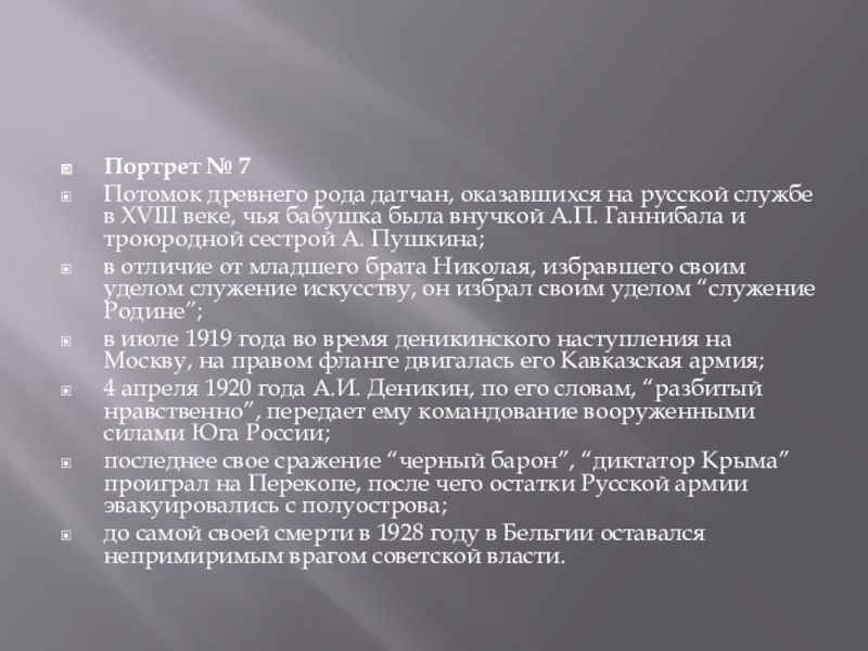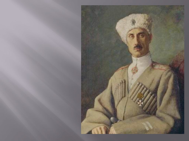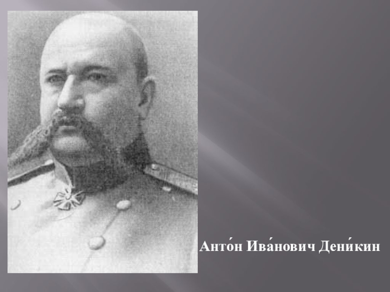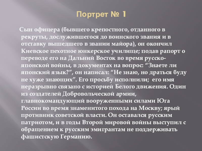 рекруты, дослужившегося до воинского звания и в отставку вышедшего в звании майора), он окончил Киевское пехотное юнкерское училище; подав рапорт о переводе его на Дальний Восток во время русско-японской войны, в документах на вопрос: “Знаете ли японский язык?”, он написал: “Не знаю, но драться буду не хуже знающих”. Его просьбу исполнили; его имя неразрывно связано с историей Белого движения. Один из создателей Добровольческой армии, главнокомандующий вооруженными силами Юга России во время знаменитого похода на Москву; ярый противник советской власти. Он оставался русским патриотом, и в годы Второй мировой войны выступил с обращением к русским эмигрантам не поддерживать фашистскую Германию.