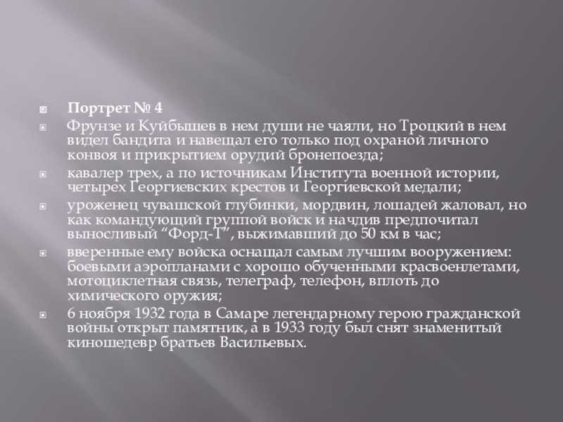 уроженец чувашской глубинки, мордвин, лошадей жаловал, но как командующий группой войск и начдив предпочитал выносливый “Форд-Т”, выжимавший до 50 км в час;