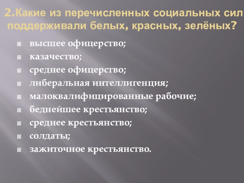 Слайд 92.Какие из перечисленных социальных сил поддерживали белых, красных, зелёных?