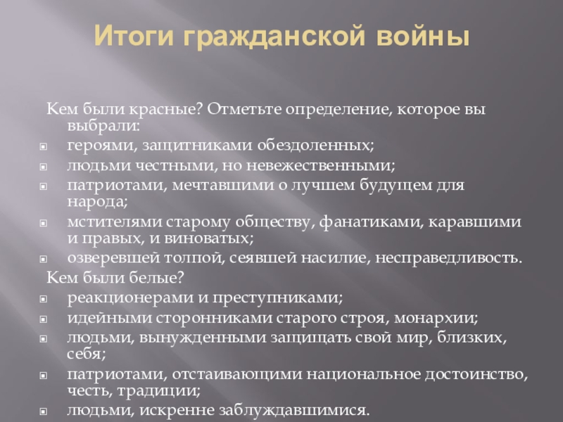 Слайд 42Кто, по вашему мнению, победил в гражданской войне? Отметьте аргументы, которые