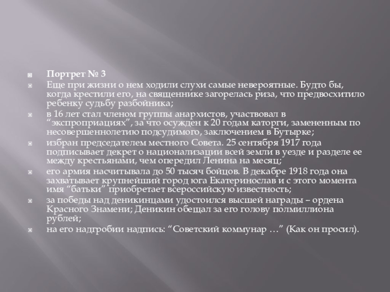 его армия насчитывала до 50 тысяч бойцов. В декабре 1918 года она захватывает крупнейший город юга Екатеринослав и с этого момента имя “батьки” приобретает всероссийскую известность;