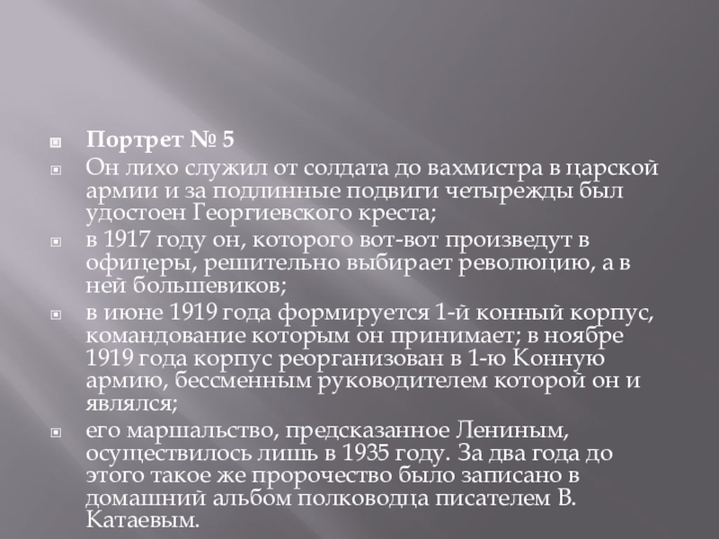 его маршальство, предсказанное Лениным, осуществилось лишь в 1935 году. За два года до этого такое же пророчество было записано в домашний альбом полководца писателем В. Катаевым.