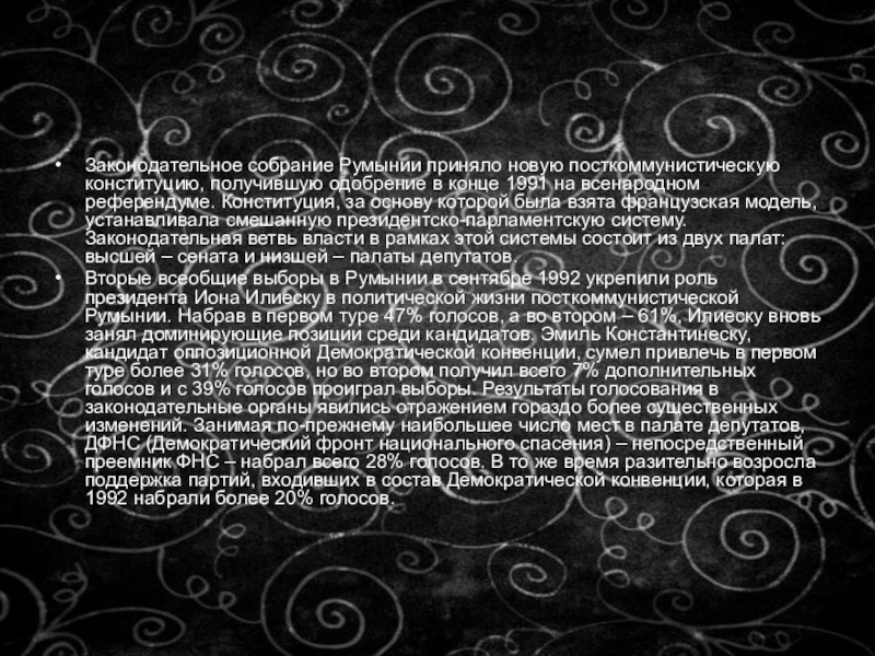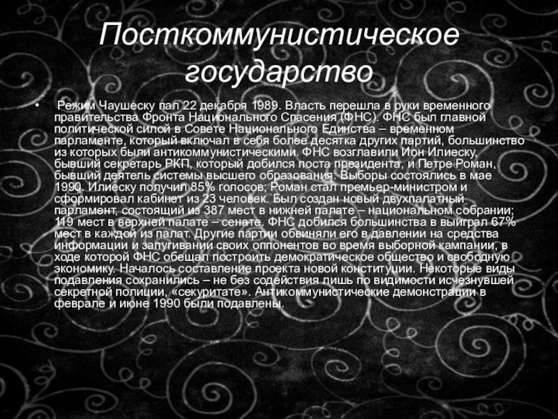 временного правительства Фронта Национального Спасения (ФНС). ФНС был главной политической силой в Совете Национального Единства – временном парламенте, который включал в себя более десятка других партий, большинство из которых были антикоммунистическими. ФНС возглавили Ион Илиеску, бывший секретарь РКП, который добился поста президента, и Петре Роман, бывший деятель системы высшего образования. Выборы состоялись в мае 1990. Илиеску получил 85% голосов; Роман стал премьер-министром и сформировал кабинет из 23 человек. Был создан новый двухпалатный парламент, состоящий из 387 мест в нижней палате – национальном собрании; 119 мест в верхней палате – сенате. ФНС добился большинства в выиграл 67% мест в каждой из палат. Другие партии обвиняли его в давлении на средства информации и запугивании своих оппонентов во время выборной кампании, в ходе которой ФНС обещал построить демократическое общество и свободную экономику. Началось составление проекта новой конституции. Некоторые виды подавления сохранились – не без содействия лишь по видимости исчезнувшей секретной полиции, «секуритате». Антикоммунистические демонстрации в феврале и июне 1990 были подавлены.