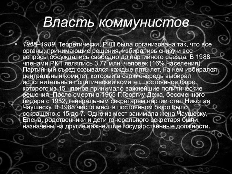избирались снизу и все вопросы обсуждались свободно до партийного съезда. В 1988 членами РКП являлись 3,77 млн. человек (16% населения). Партийный съезд созывался каждые пять лет, на нем избирался центральный комитет, который в свою очередь выбирал исполнительный политический комитет, постоянное бюро которого из 15 членов принимало важнейшие политические решения. После смерти в 1965 Г.Георгиу-Дежа, бессменного лидера с 1952, генеральным секретарем партии стал Николае Чаушеску. В 1988 число мест в постоянном бюро было сокращено с 15 до 7. Одно из мест занимала жена Чаушеску, Елена, родственники и дети генерального секретаря были назначены на другие важнейшие государственные должности.