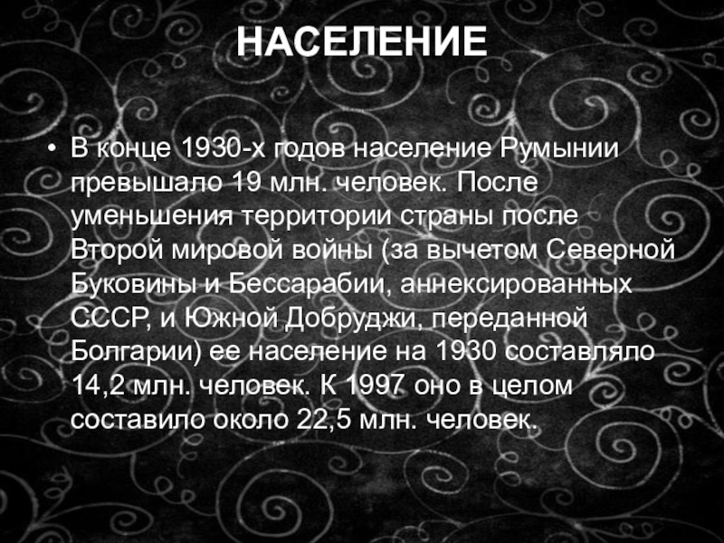 уменьшения территории страны после Второй мировой войны (за вычетом Северной Буковины и Бессарабии, аннексированных СССР, и Южной Добруджи, переданной Болгарии) ее население на 1930 составляло 14,2 млн. человек. К 1997 оно в целом составило около 22,5 млн. человек.