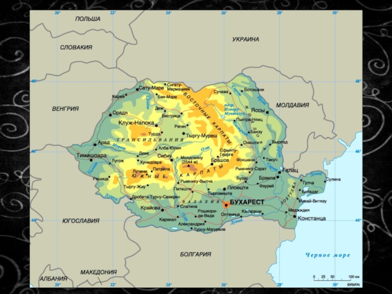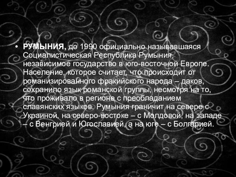 Европе. Население, которое считает, что происходит от романизированного фракийского народа – даков, сохранило язык романской группы, несмотря на то, что проживало в регионе с преобладанием славянских языков. Румыния граничит на севере с Украиной, на северо-востоке – с Молдовой, на западе – с Венгрией и Югославией, а на юге – с Болгарией.