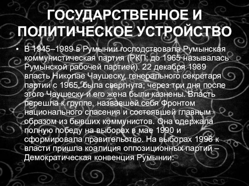 (РКП; до 1965 называлась Румынской рабочей партией). 22 декабря 1989 власть Николае Чаушеску, генерального секретаря партии с 1965, была свергнута; через три дня после этого Чаушеску и его жена были казнены. Власть перешла к группе, назвавшей себя Фронтом национального спасения и состоявшей главным образом из бывших коммунистов. Она одержала полную победу на выборах в мае 1990 и сформировала правительство. На выборах 1996 к власти пришла коалиция оппозиционных партий – Демократическая конвенция Румынии.