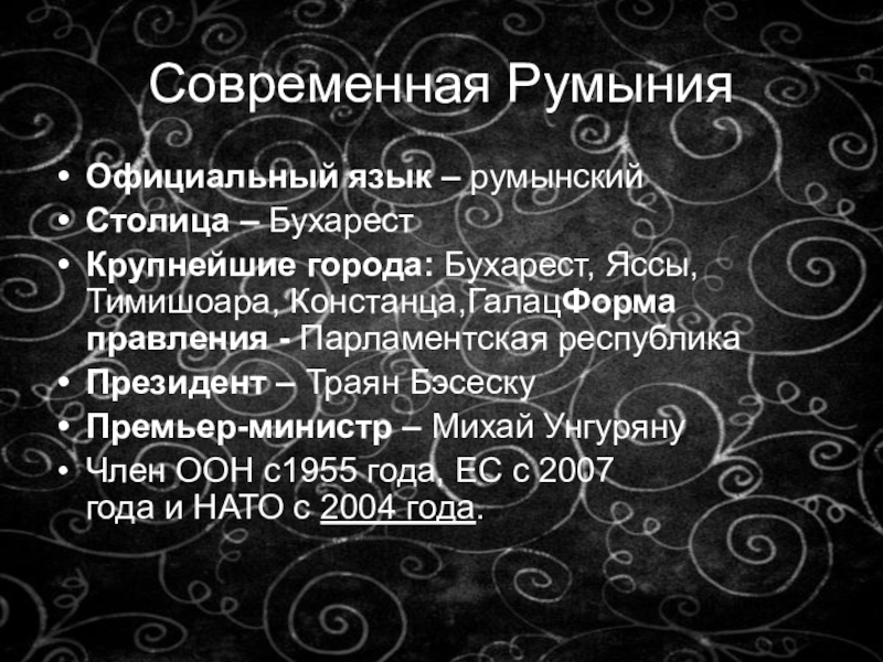 Крупнейшие города: Бухарест, Яссы,Тимишоара, Констанца,ГалацФорма правления -