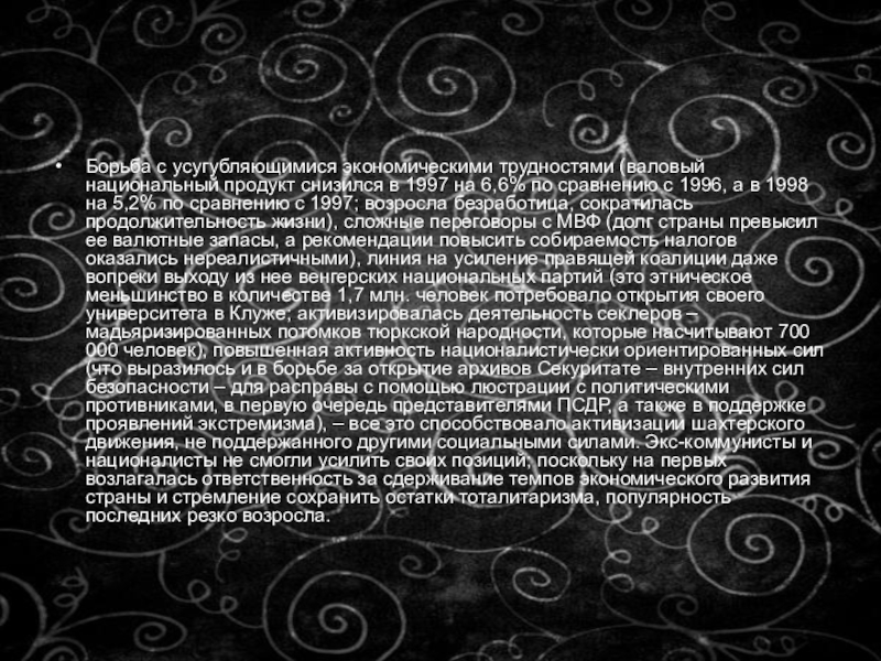 на 6,6% по сравнению с 1996, а в 1998 на 5,2% по сравнению с 1997; возросла безработица, сократилась продолжительность жизни), сложные переговоры с МВФ (долг страны превысил ее валютные запасы, а рекомендации повысить собираемость налогов оказались нереалистичными), линия на усиление правящей коалиции даже вопреки выходу из нее венгерских национальных партий (это этническое меньшинство в количестве 1,7 млн. человек потребовало открытия своего университета в Клуже; активизировалась деятельность секлеров – мадьяризированных потомков тюркской народности, которые насчитывают 700 000 человек), повышенная активность националистически ориентированных сил (что выразилось и в борьбе за открытие архивов Секуритате – внутренних сил безопасности – для расправы с помощью люстрации с политическими противниками, в первую очередь представителями ПСДР, а также в поддержке проявлений экстремизма), – все это способствовало активизации шахтерского движения, не поддержанного другими социальными силами. Экс-коммунисты и националисты не смогли усилить своих позиций; поскольку на первых возлагалась ответственность за сдерживание темпов экономического развития страны и стремление сохранить остатки тоталитаризма, популярность последних резко возросла.