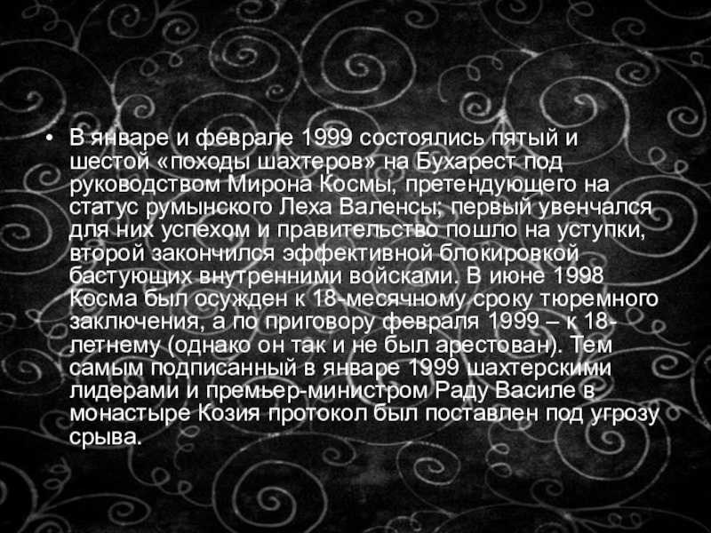 под руководством Мирона Космы, претендующего на статус румынского Леха Валенсы; первый увенчался для них успехом и правительство пошло на уступки, второй закончился эффективной блокировкой бастующих внутренними войсками. В июне 1998 Косма был осужден к 18-месячному сроку тюремного заключения, а по приговору февраля 1999 – к 18-летнему (однако он так и не был арестован). Тем самым подписанный в январе 1999 шахтерскими лидерами и премьер-министром Раду Василе в монастыре Козия протокол был поставлен под угрозу срыва.