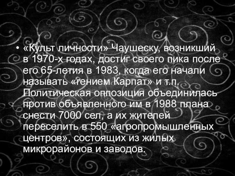 его 65-летия в 1983, когда его начали называть «гением Карпат» и т.п. Политическая оппозиция объединилась против объявленного им в 1988 плана снести 7000 сел, а их жителей переселить в 550 «агропромышленных центров», состоящих из жилых микрорайонов и заводов.