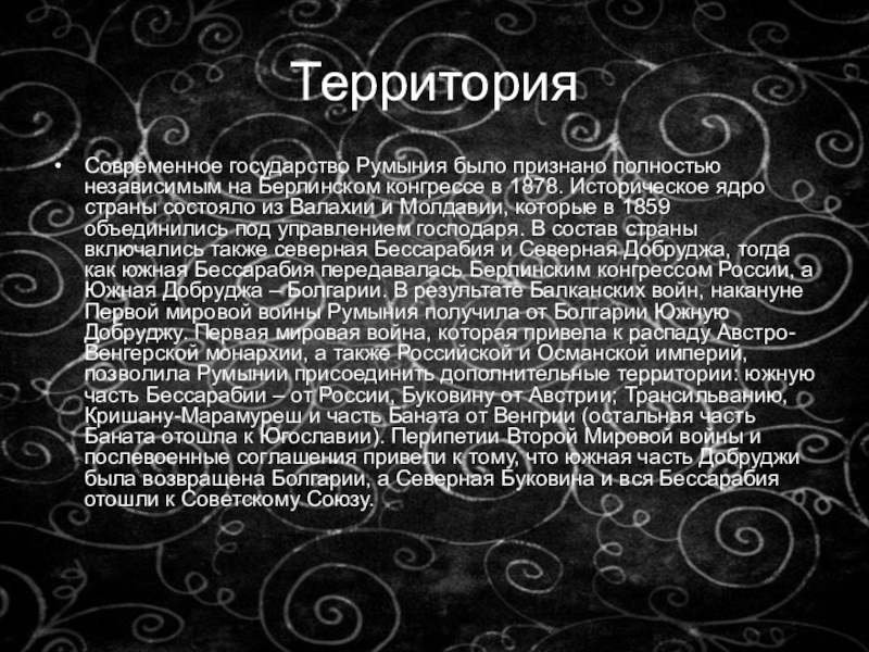1878. Историческое ядро страны состояло из Валахии и Молдавии, которые в 1859 объединились под управлением господаря. В состав страны включались также северная Бессарабия и Северная Добруджа, тогда как южная Бессарабия передавалась Берлинским конгрессом России, а Южная Добруджа – Болгарии. В результате Балканских войн, накануне Первой мировой войны Румыния получила от Болгарии Южную Добруджу. Первая мировая война, которая привела к распаду Австро-Венгерской монархии, а также Российской и Османской империй, позволила Румынии присоединить дополнительные территории: южную часть Бессарабии – от России, Буковину от Австрии; Трансильванию, Кришану-Марамуреш и часть Баната от Венгрии (остальная часть Баната отошла к Югославии). Перипетии Второй Мировой войны и послевоенные соглашения привели к тому, что южная часть Добруджи была возвращена Болгарии, а Северная Буковина и вся Бессарабия отошли к Советскому Союзу.