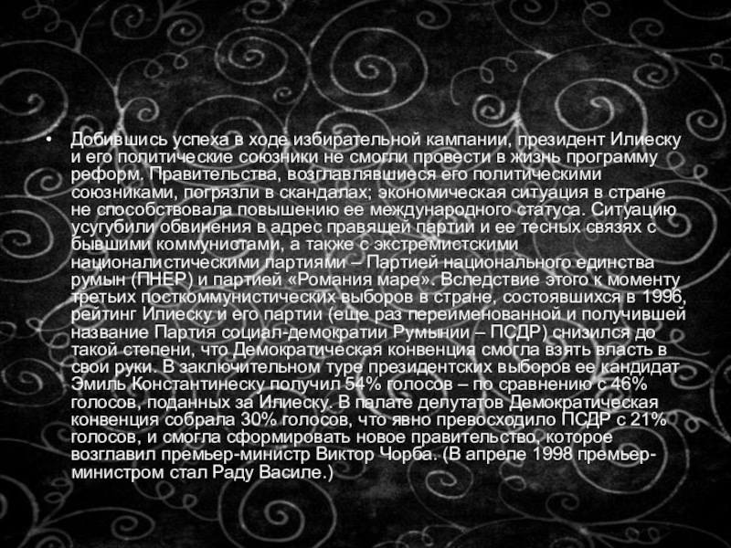 союзники не смогли провести в жизнь программу реформ. Правительства, возглавлявшиеся его политическими союзниками, погрязли в скандалах; экономическая ситуация в стране не способствовала повышению ее международного статуса. Ситуацию усугубили обвинения в адрес правящей партии и ее тесных связях с бывшими коммунистами, а также с экстремистскими националистическими партиями – Партией национального единства румын (ПНЕР) и партией «Романия маре». Вследствие этого к моменту третьих посткоммунистических выборов в стране, состоявшихся в 1996, рейтинг Илиеску и его партии (еще раз переименованной и получившей название Партия социал-демократии Румынии – ПСДР) снизился до такой степени, что Демократическая конвенция смогла взять власть в свои руки. В заключительном туре президентских выборов ее кандидат Эмиль Константинеску получил 54% голосов – по сравнению с 46% голосов, поданных за Илиеску. В палате депутатов Демократическая конвенция собрала 30% голосов, что явно превосходило ПСДР с 21% голосов, и смогла сформировать новое правительство, которое возглавил премьер-министр Виктор Чорба. (В апреле 1998 премьер-министром стал Раду Василе.)