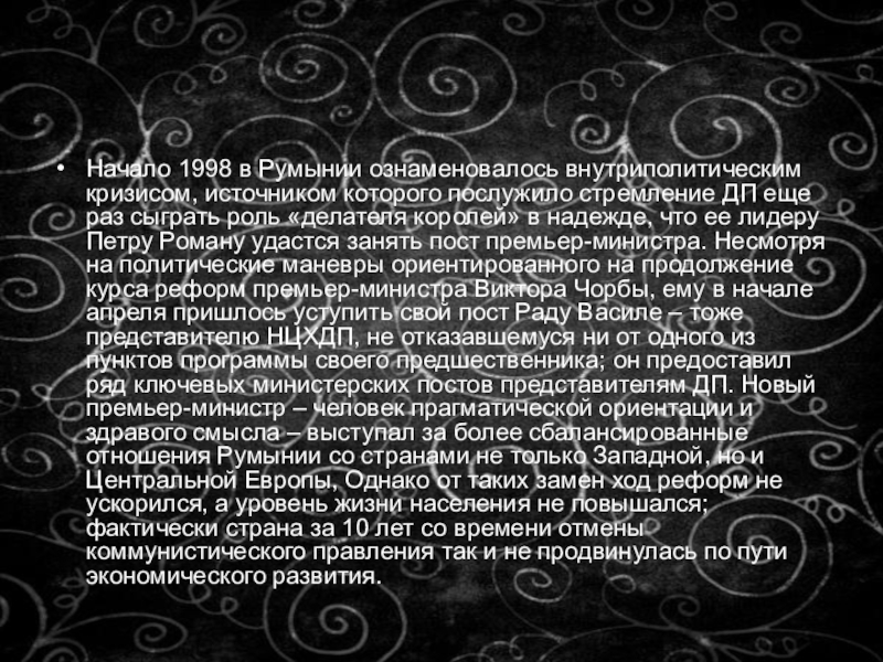 ДП еще раз сыграть роль «делателя королей» в надежде, что ее лидеру Петру Роману удастся занять пост премьер-министра. Несмотря на политические маневры ориентированного на продолжение курса реформ премьер-министра Виктора Чорбы, ему в начале апреля пришлось уступить свой пост Раду Василе – тоже представителю НЦХДП, не отказавшемуся ни от одного из пунктов программы своего предшественника; он предоставил ряд ключевых министерских постов представителям ДП. Новый премьер-министр – человек прагматической ориентации и здравого смысла – выступал за более сбалансированные отношения Румынии со странами не только Западной, но и Центральной Европы, Однако от таких замен ход реформ не ускорился, а уровень жизни населения не повышался; фактически страна за 10 лет со времени отмены коммунистического правления так и не продвинулась по пути экономического развития.