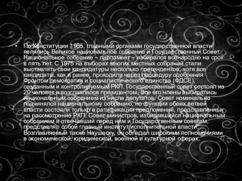 и Государственный Совет. Национальное собрание – парламент – избирался всенародно на срок в пять лет. С 1975 на выборах многих местных собраний стали выставлять свои кандидатуры несколько претендентов, хотя все кандидаты, как и ранее, проходили через процедуру одобрения Фронтом демократии и социалистического единства (ФДСЕ), созданным и контролируемым РКП. Государственный совет состоял из 20 человек и возглавлялся президентом. Все его члены выбирались национальным собранием из числа депутатов. Совет номинально подчинялся национальному собранию, но функции обеих ветвей власти состояли только в ратификации предложений, представленных на рассмотрение РКП. Совет министров, избиравшийся национальным собранием и отвечавший перед ним и Государственным советом, представлял собой главный институт исполнительной власти. Возглавляемый также Чаушеску, он обладал широкими полномочиями в экономической, юридической, военной и культурной сферах.