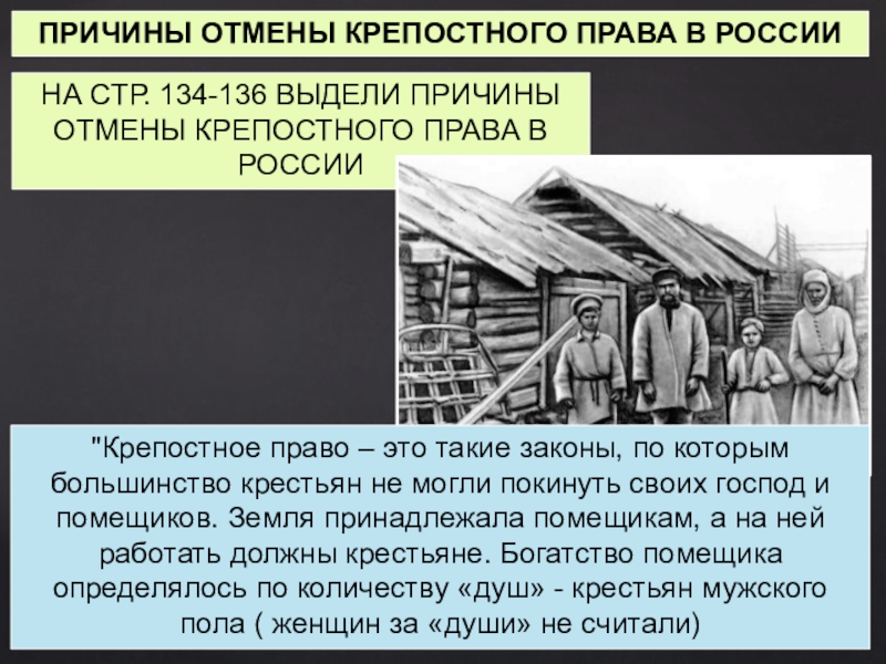 "Крепостное право – это такие законы, по которым большинство крестьян не могли покинуть своих господ и помещиков. Земля принадлежала помещикам, а на ней работать должны крестьяне. Богатство помещика определялось по количеству «душ» - крестьян мужского пола ( женщин за «души» не считали)