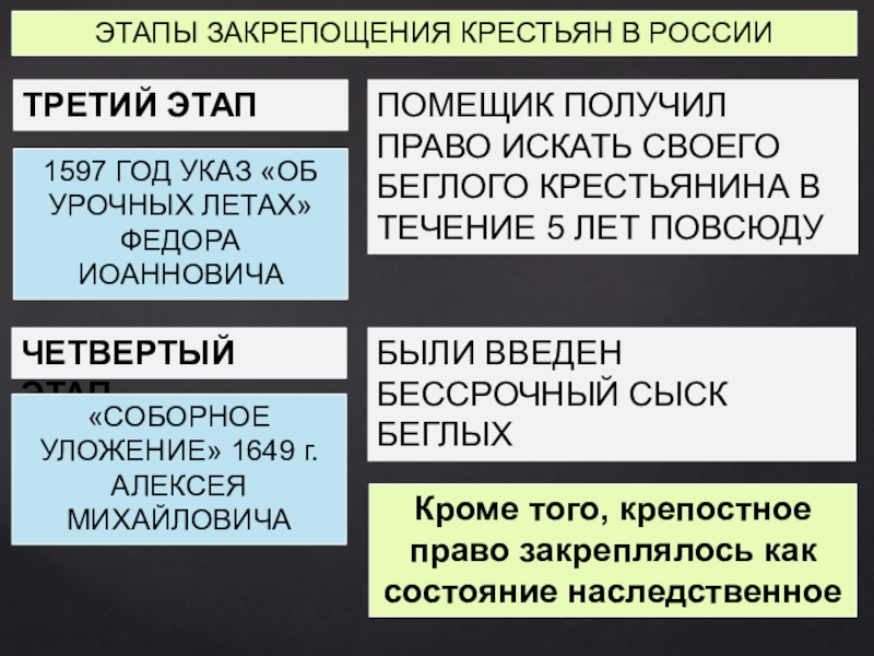Кроме того, крепостное право закреплялось как состояние наследственное