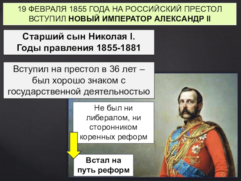 САМ ИМПЕРАТОР АЛЕКСАНДР II, ОСОЗНАВ ПРИЧИНЫ ПОРАЖЕНИЯ РОССИИ В КРЫМСКОЙ ВОЙНЕ, ВСТАЛ НА ПУТЬ РЕФОРМ.