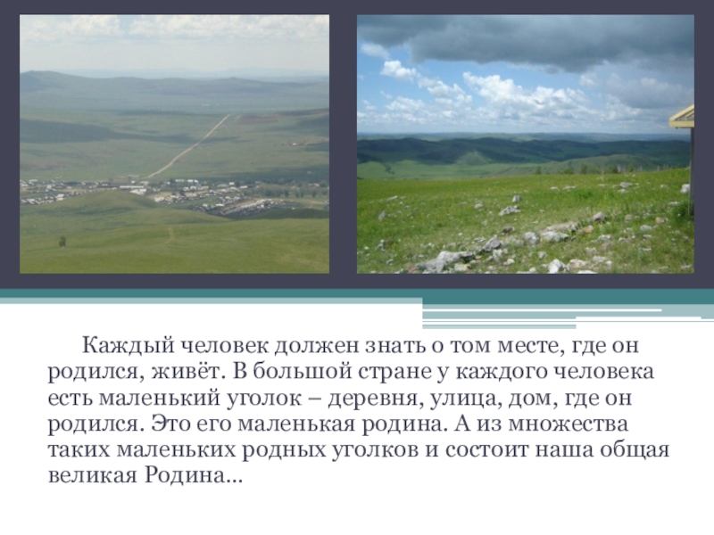 Каждый человек должен знать о том месте, где он родился, живёт. В большой стране у каждого человека есть маленький уголок – деревня, улица, дом, где он родился. Это его маленькая родина. А из
