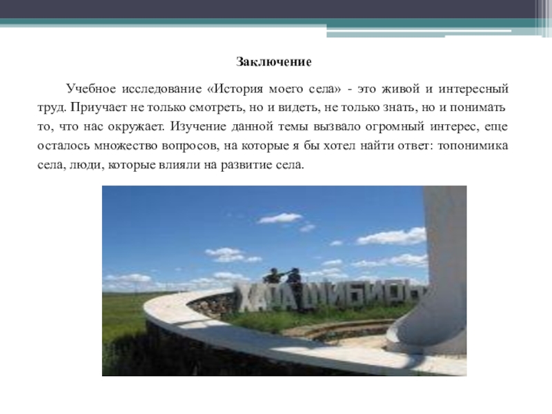 Заключение   Учебное исследование «История моего села» - это живой и интересный труд. Приучает не только