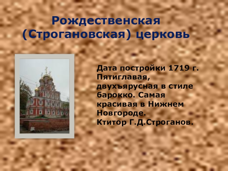 Рождественская (Строгановская) церковьДата постройки 1719 г.Пятиглавая, двухъярусная в стиле барокко. Самая красивая в Нижнем Новгороде.Ктитор Г.Д.Строганов.