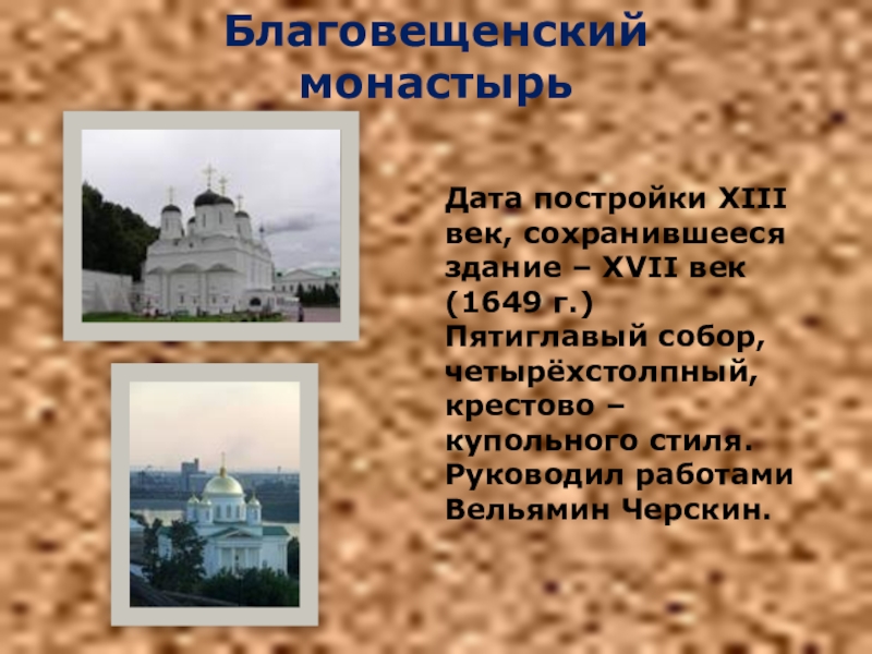 Благовещенский монастырьДата постройки XIII век, сохранившееся здание – XVII век (1649 г.)Пятиглавый собор, четырёхстолпный, крестово – купольного стиля.Руководил работами Вельямин Черскин.