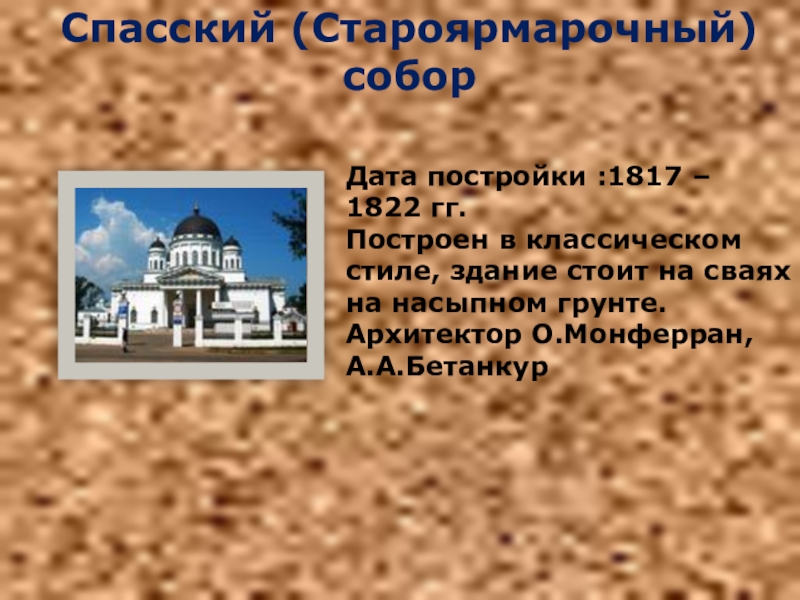 Спасский (Староярмарочный) соборДата постройки :1817 – 1822 гг.Построен в классическом стиле, здание стоит на сваях на насыпном